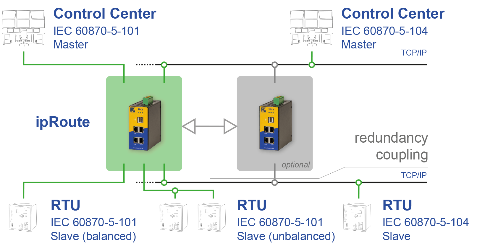 If the IEC 60870-5-101 - and/or IEC 60870-5-104 devices are not mutually compatible, i.e. address spaces do not match, information representation is different, we recommend using ipConvLite and ipConv.