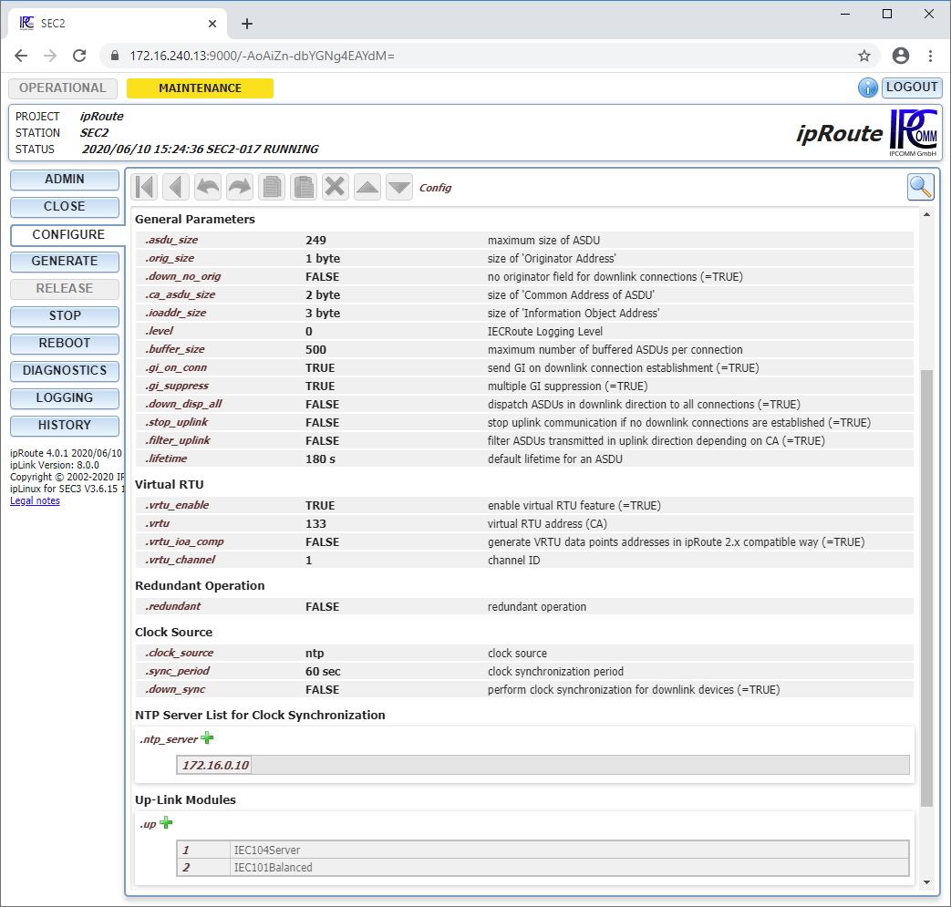 | Clock sync | ipRoute allows clock synchronization of substations. The ipRoute internal clock can be synchronized via NTP or IEC. Following its own synchronization, any connected substations are synchronized. |
